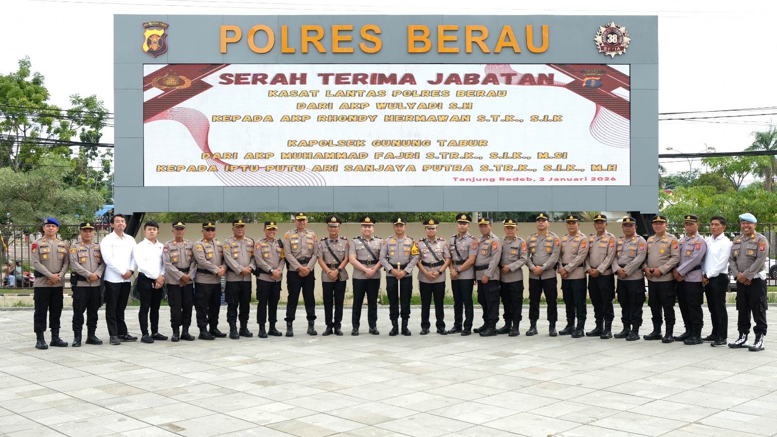 Dalam pelaksanaan Sertijab tersebut, jabatan Kasat Lantas Polres Berau secara resmi diserahterimakan dari AKP Wulyadi kepada AKP Rhondy Hermawan. Sementara itu, jabatan Kapolsek Gunung Tabur diserahterimakan dari AKP Muhammad Fajri kepada Iptu Putu Ari Sanjaya Putra.