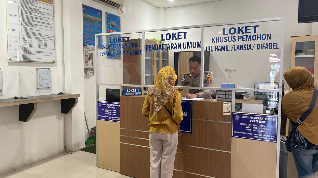 Personel Satuan Lalu Lintas (Satlantas) Polres Berau memberikan penjelasan langsung kepada para pemohon Surat Izin Mengemudi (SIM) terkait mekanisme dan tahapan penerbitan SIM. Kegiatan ini dilaksanakan di ruang pelayanan SIM Satlantas Polres Berau sebagai bentuk pelayanan prima kepada masyarakat.