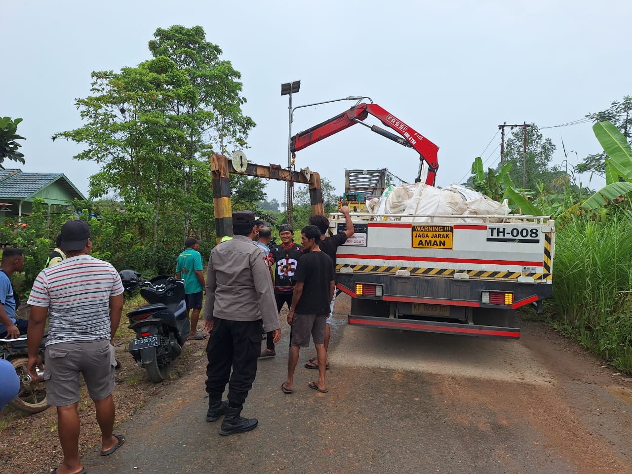 Mendapat laporan, Personel Polsek Gunung Tabur langsung bergerak cepat menuju lokasi untuk melakukan penanganan awal. Langkah-langkah yang dilakukan antara lain pengecekan Tempat Kejadian Perkara (TKP), dokumentasi kerusakan, pengaturan arus lalu lintas, serta evakuasi portal jalan menggunakan kendaraan crane agar jalur dapat kembali digunakan.