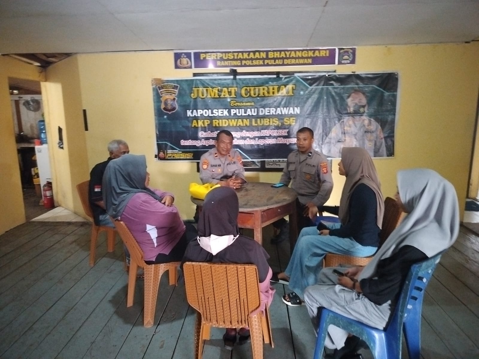 POLRESBERAU.COM, PULAUDERAWAN – Polsek Pulau Derawan turut aktif mendengarkan aspirasi dan keluhan masyarakat dengan menggelar acara “JUM’AT CURHAT” pada hari Jum’at, 13 Oktober 2023. Acara ini memberikan warga kesempatan untuk menyuarakan permasalahan yang mereka hadapi, sambil mencari solusi bersama pihak berwenang. Dalam pertemuan tersebut, beberapa permasalahan masyarakat menjadi sorotan utama, termasuk kebutuhan angkutan pelajar yang aman dan ketersediaan bahan bakar minyak (BBM) solar bagi nelayan.
