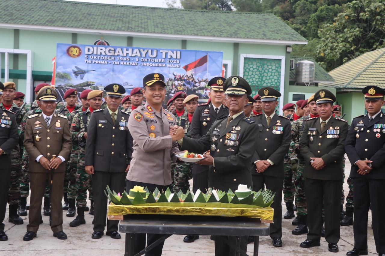 Polres Berau – Dalam rangka memperingati Hari Ulang Tahun (HUT) Tentara Nasional Indonesia (TNI) ke-80 tahun 2025, jajaran Pejabat Utama (PJU) Polres Berau menggelar kegiatan Silaturahmi dan Penyerahan Tumpeng ke sejumlah markas TNI di wilayah Kabupaten Berau, Minggu (5/10/2025). Kegiatan berlangsung penuh keakraban dengan mengusung tema “TNI Prima, TNI Rakyat, Indonesia Maju.”